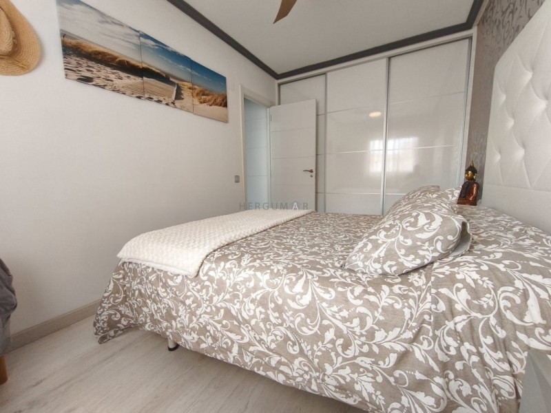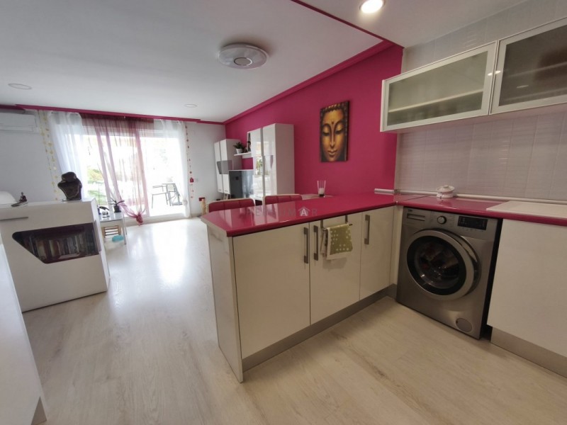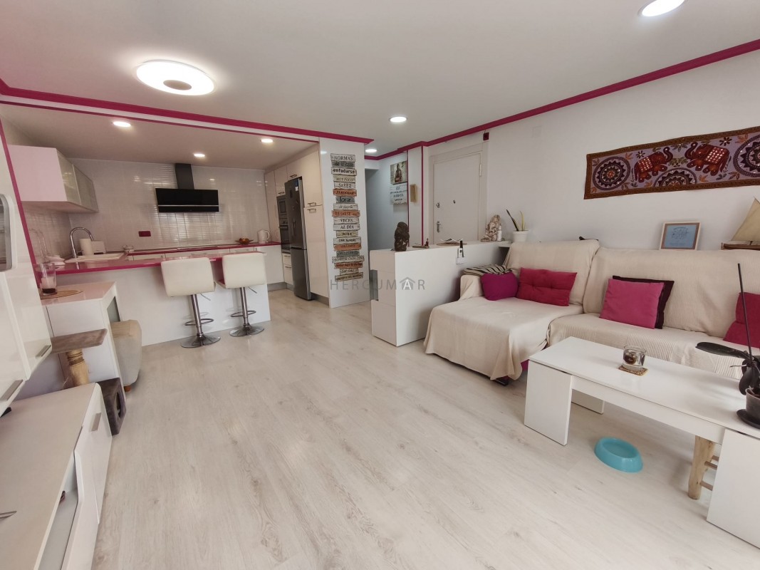 El inmueble se distribuye en 2 dormitorios, un amplio baño completo con plato de ducha, un gran salón con la cocina integrada, separada por una barra americana y una increíble terraza con vistas al mar